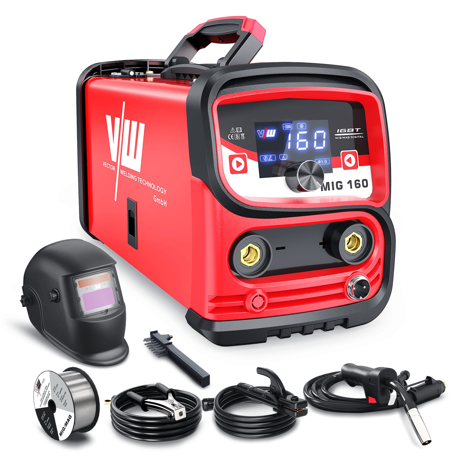 - Kit complet : contient le poste à souder combiné MIG 160, la torche à fil fourré (câble de 1,5 m), la pince de masse (câble de 2 m), le porte-électrode (câble de 2 m), le rouleau de fil fourré NoGas 1,0mm (0,5kg), la brosse et le mode d’emploi.