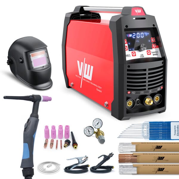 Dans sa version set complète, l’appareil est immédiatement prêt à l’emploi : En plus du poste à souder performant, vous recevez des accessoires professionnels parfaitement adaptés aux besoins dans le domaine du TIG et du MMA – dont une torche TIG de haute qualité (WP-26, raccordement combiné gaz/électricité), un casque de soudage automatique, ainsi que des baguettes de soudage de 1 kg pour l’aluminium, l’acier inoxydable et l’acier. Des composants importants tels que 10 électrodes en tungstène, une pince à électrodes avec 2 m de câble, une pince de masse, un détendeur pour argon/CO₂ et le tuyau de raccordement correspondant sont également inclus dans la livraison. Ce kit complet fait du London 2400 la solution parfaite pour tous ceux qui veulent se lancer sans détour.